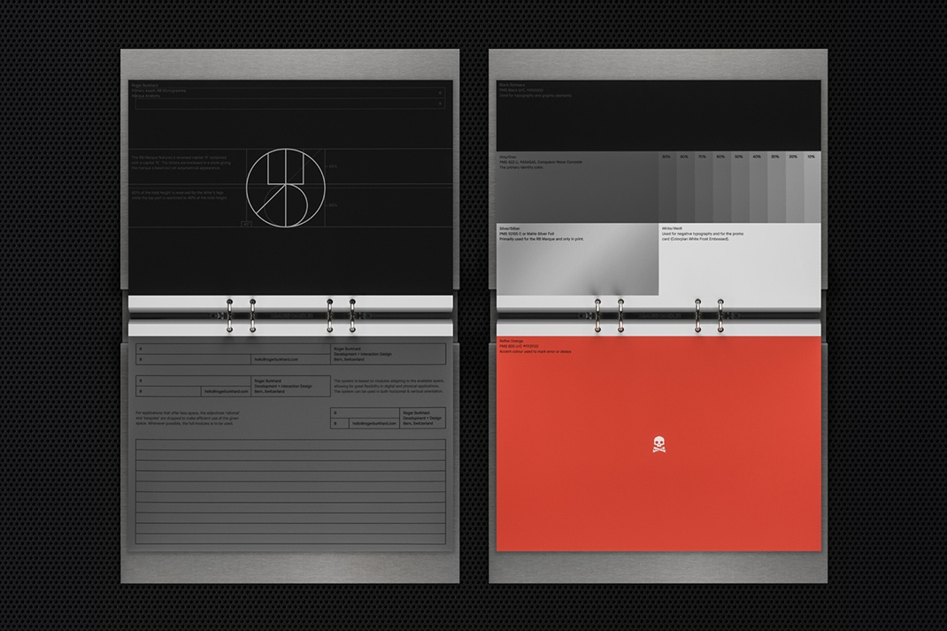 一個響應的標題,其中包含關鍵的聯系人詳細信息,據說是品牌標志的延伸,一個具有反轉'R'和'B'的會標。就像支撐Roger Burkhard工作特征的精確系統的代碼線一樣,品牌識別旨在找到形式和功能的引人注目的交叉點。響應式網格響應系統,以及響應式標題,水平延伸以適應格式,并在整個過程中建立美學和有用的連續性。這并不罕見,但在不同尋常的材料中應用具有交流的廣度和視覺區別。