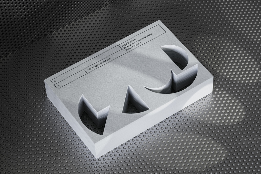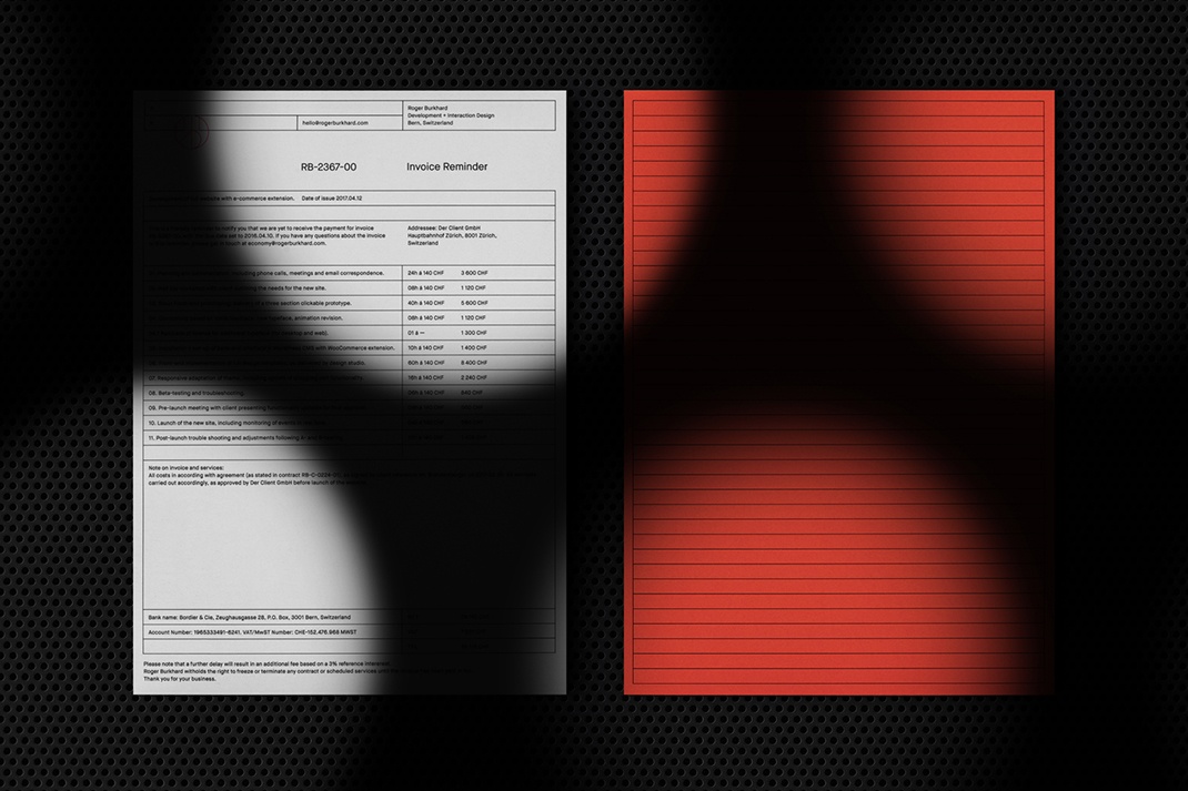 這是一個品牌標識,涉及Roger Burkhard的方法和工作的多層次性質。數字和物質世界的差異得到了很好的解決,從數字設計作為工藝的明顯表達,到模切拼圖的更微妙的解決問題的本質,最后到臉頰性質的角色和舌頭。明亮的熒光橙用于發票提醒。